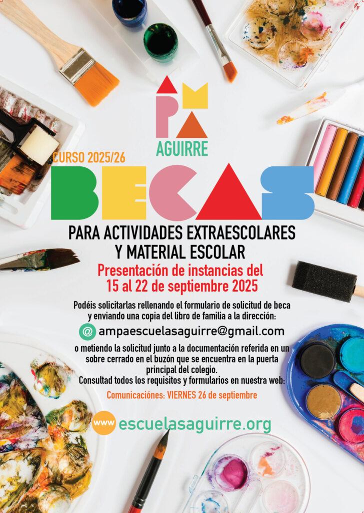 Podéis solicitar la beca para las Actividades Extraescolares ofertadas en el curso 2025/2026, rellenando el formulario de solicitud de beca y enviando una copia del libro de familia a la dirección: ampaescuelasaguirre@gmail.com, o metiendo la solicitud junto a la documentación requerida en un sobre cerrado en el buzón que se encuentra en la puerta principal del colegio.