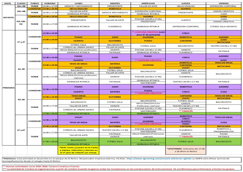 Echa un vistazo a nuestro cuadrante de extraescolares provisional y descubre qué tenemos: